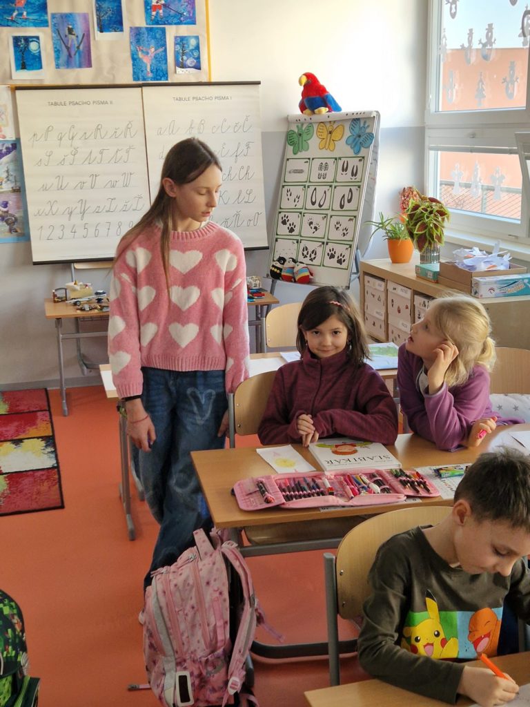 Dnes učily prvňáčky dívky ze 6.B. Připravily si pro ně hry na procvičování písmenek. Zpestření výuky všechny děti ocenily.
