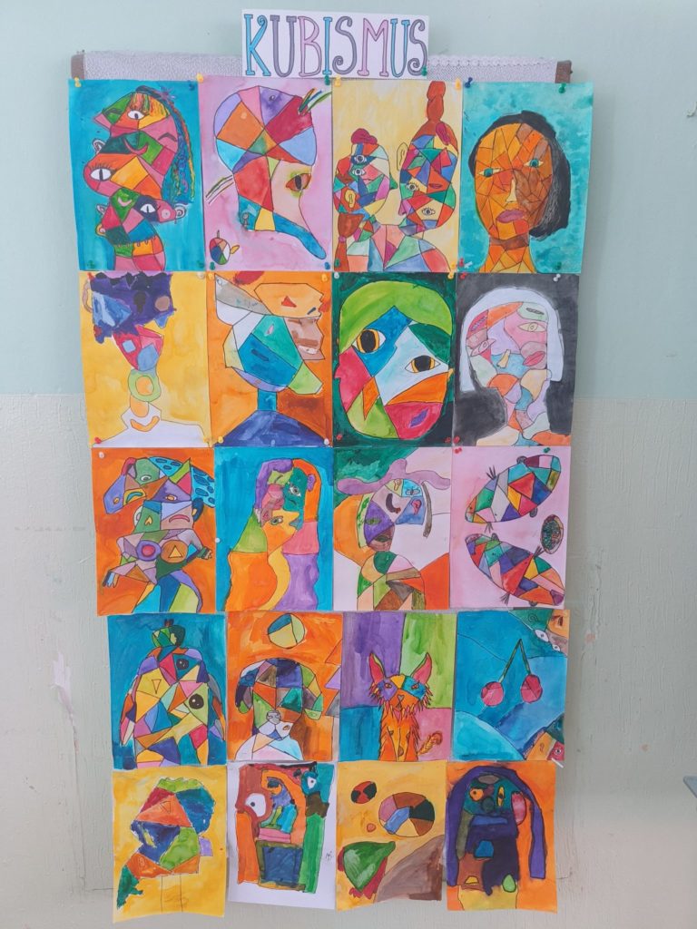Žáci 4.B si v hodinách výtvarné výchovy vyzkoušeli tvorbu inspirovanou uměleckým směrem kubismus. Seznámili se s uměním Pabla Picassa a tím, jak lze zobrazit tvář, zvířata i různé předměty pomocí…