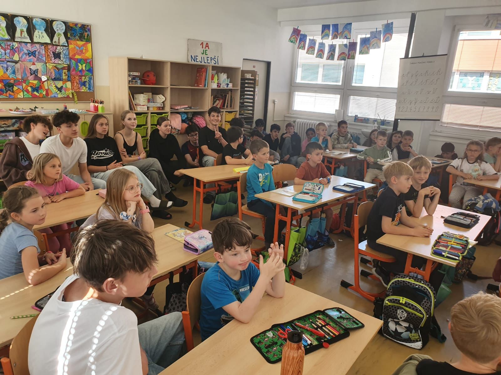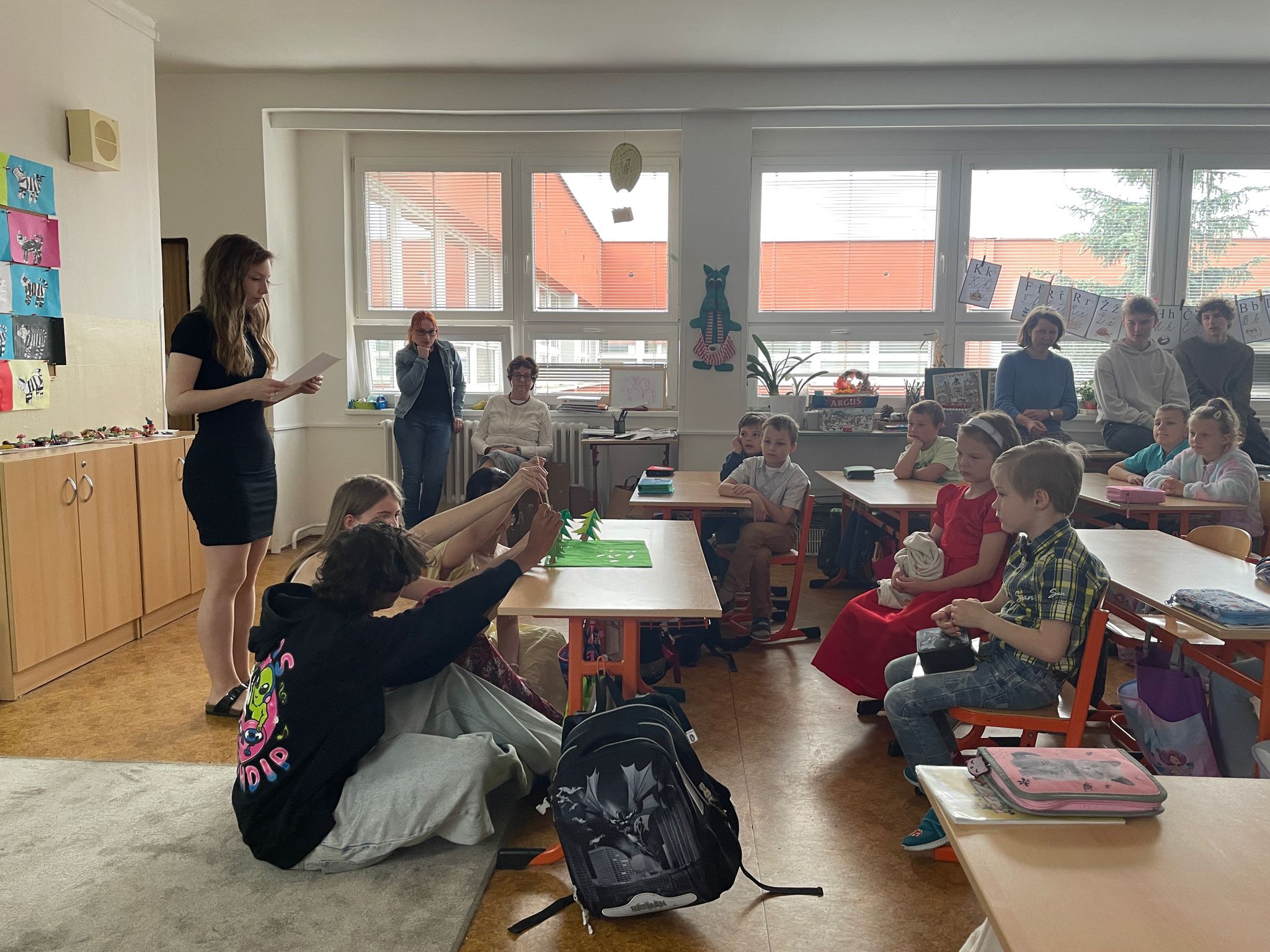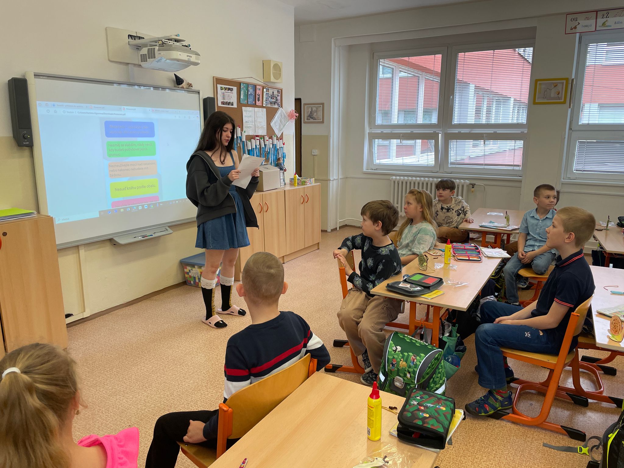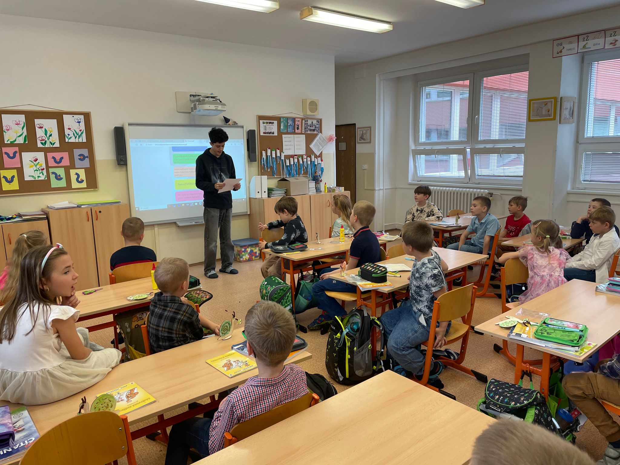Deváťáci tvořili v hodině českého jazyka autorské bajky. Poté s nimi dále pracovali. Některé namluvili jako audionahrávku, některé zdramatizovali, k jedné vytvořili kulisy s loutkami. Všechny bajky pak představili nejmenším divákům a posluchačům naší školy, prvňáčkům. Těm se bajky natolik líbily, že se rozhodli je zilustrovat. Těšíme se na výslednou knihu bajek, která propojí nejmenší a nejstarší žáky naší školy.