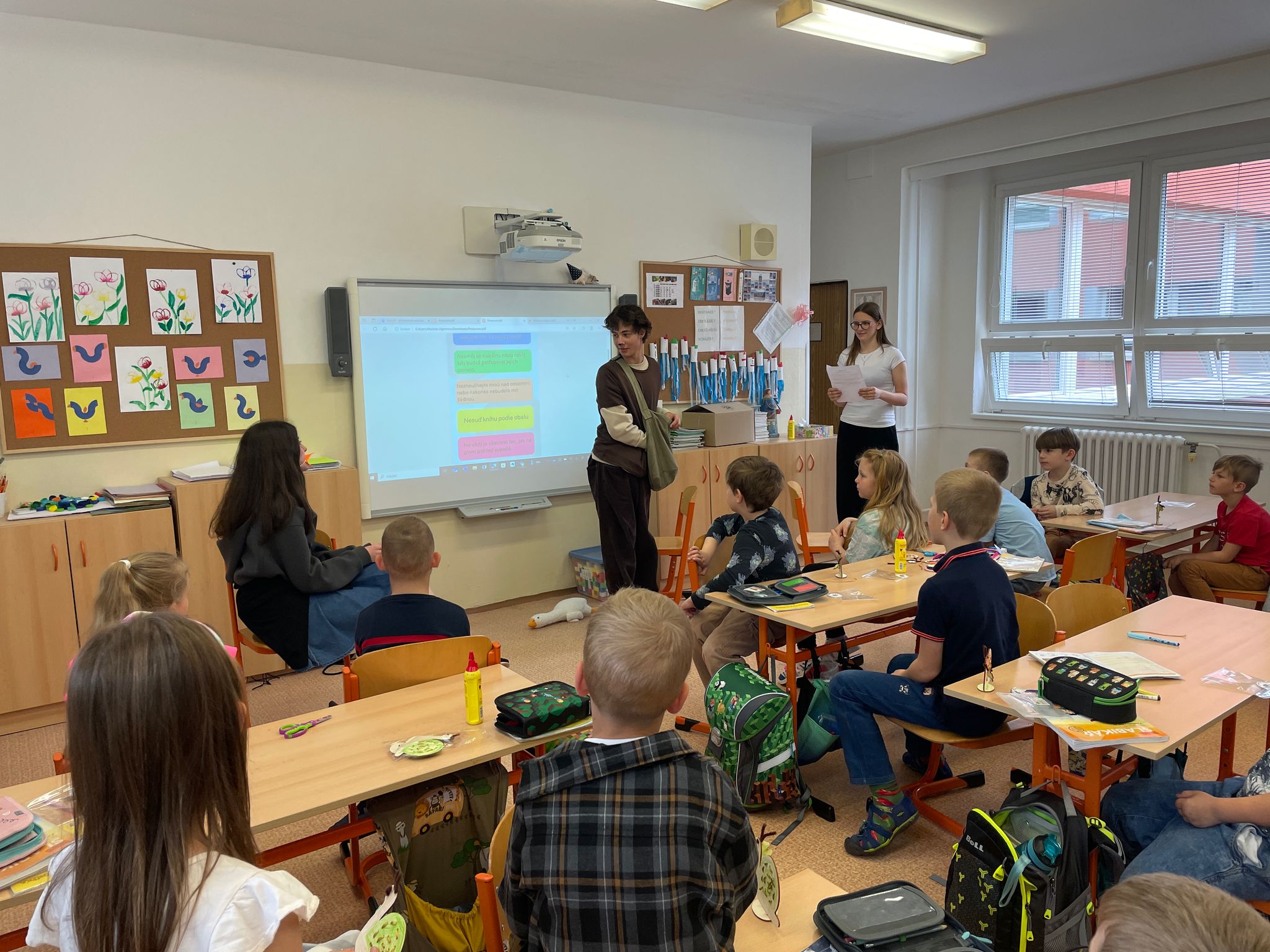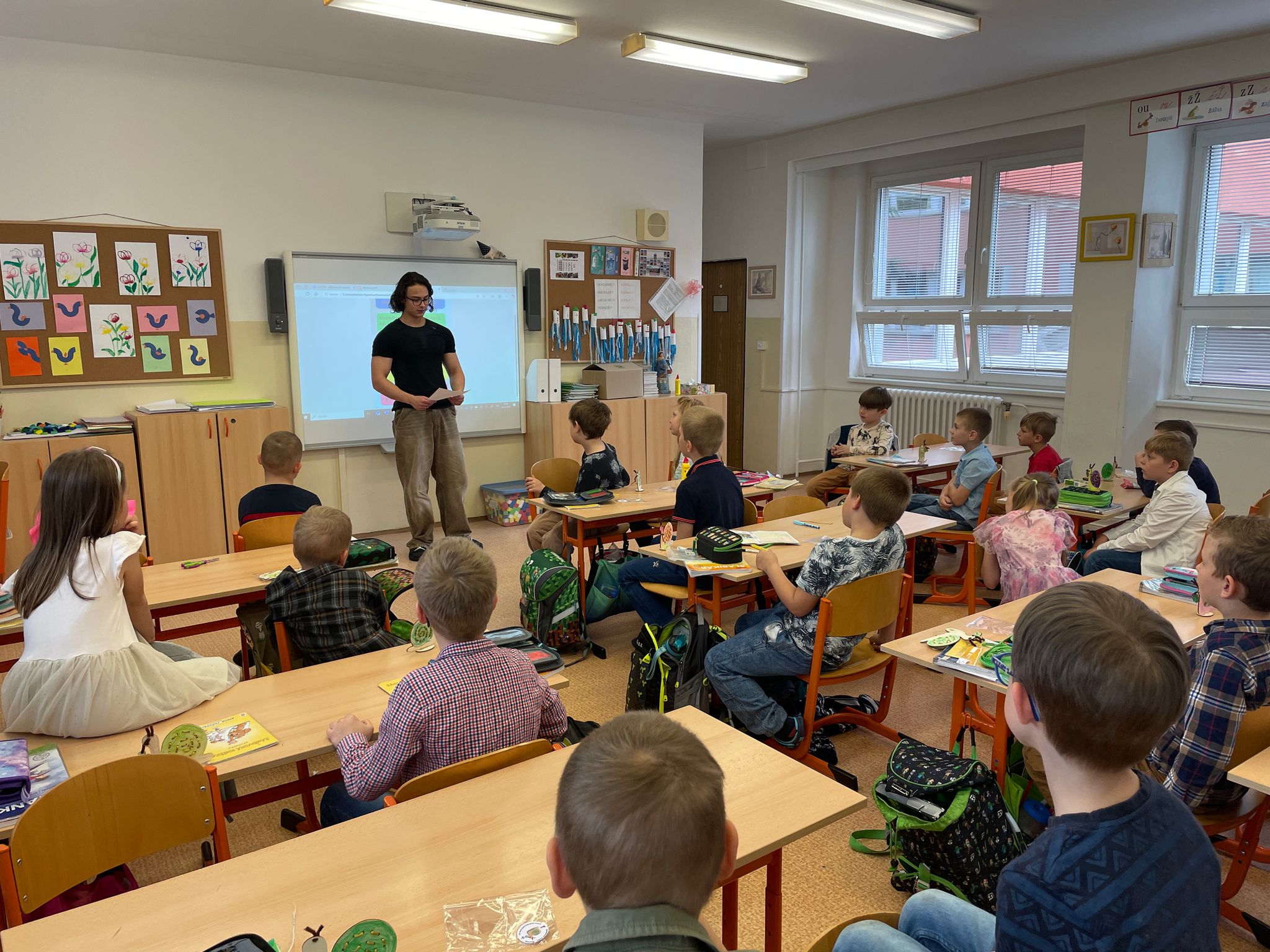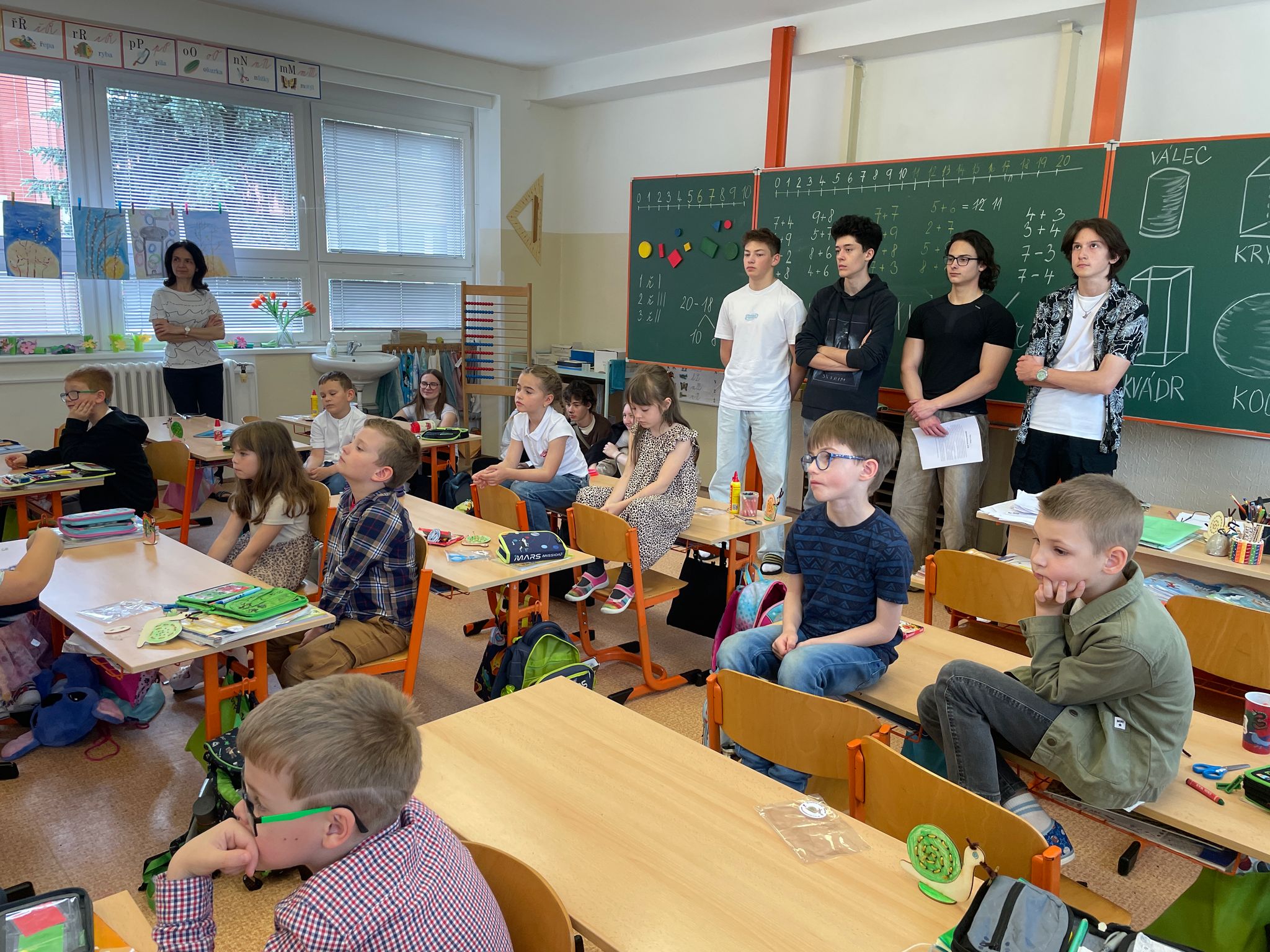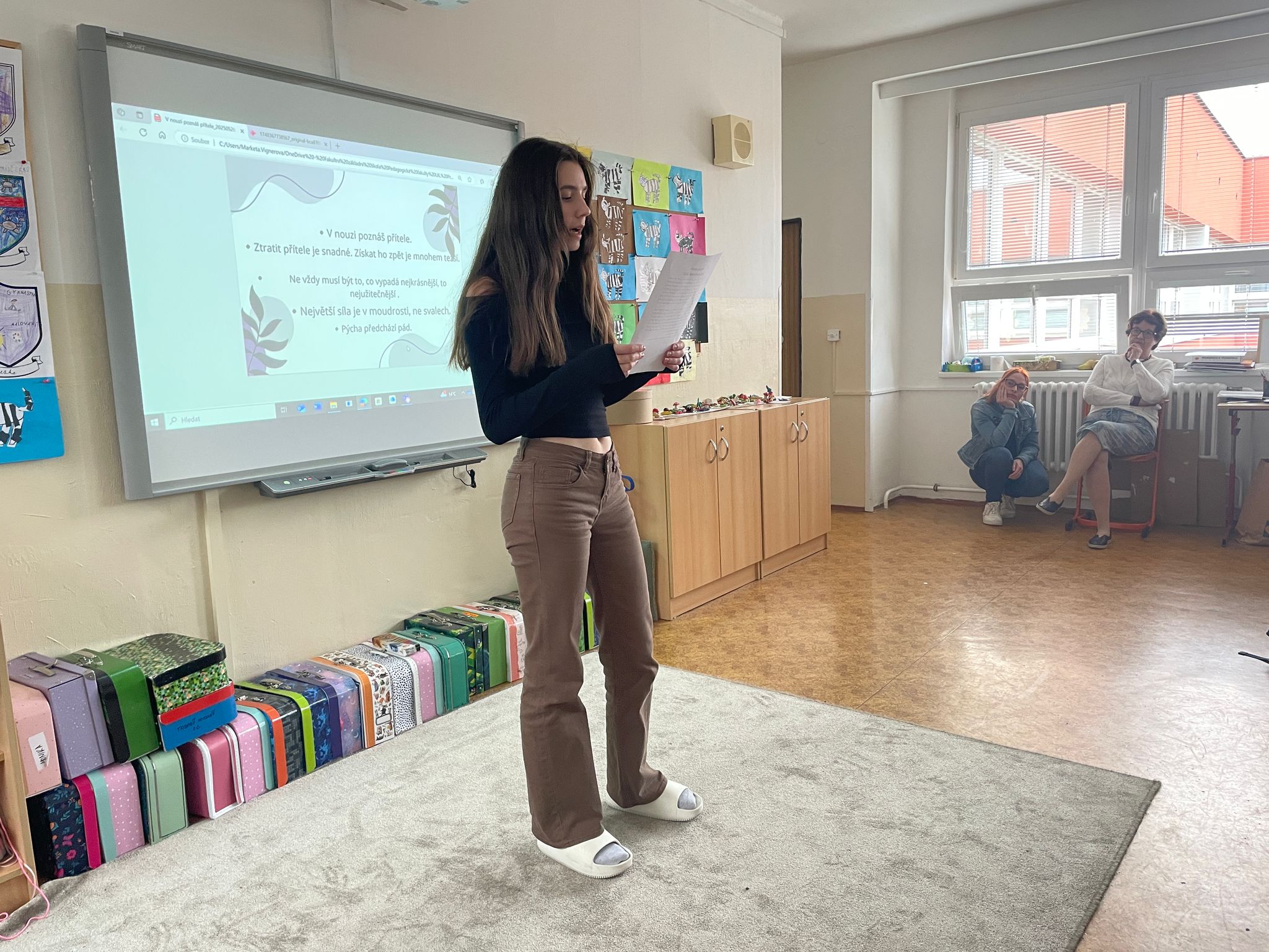Deváťáci tvořili v hodině českého jazyka autorské bajky. Poté s nimi dále pracovali. Některé namluvili jako audionahrávku, některé zdramatizovali, k jedné vytvořili kulisy s loutkami. Všechny bajky pak představili nejmenším divákům a posluchačům naší školy, prvňáčkům. Těm se bajky natolik líbily, že se rozhodli je zilustrovat. Těšíme se na výslednou knihu bajek, která propojí nejmenší a nejstarší žáky naší školy.