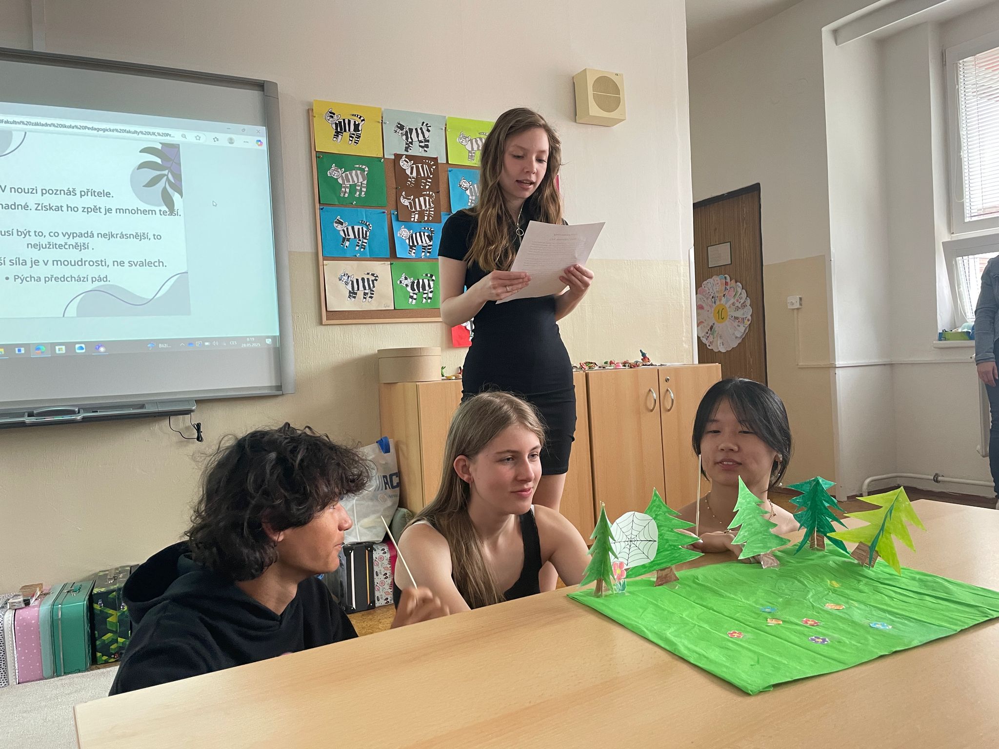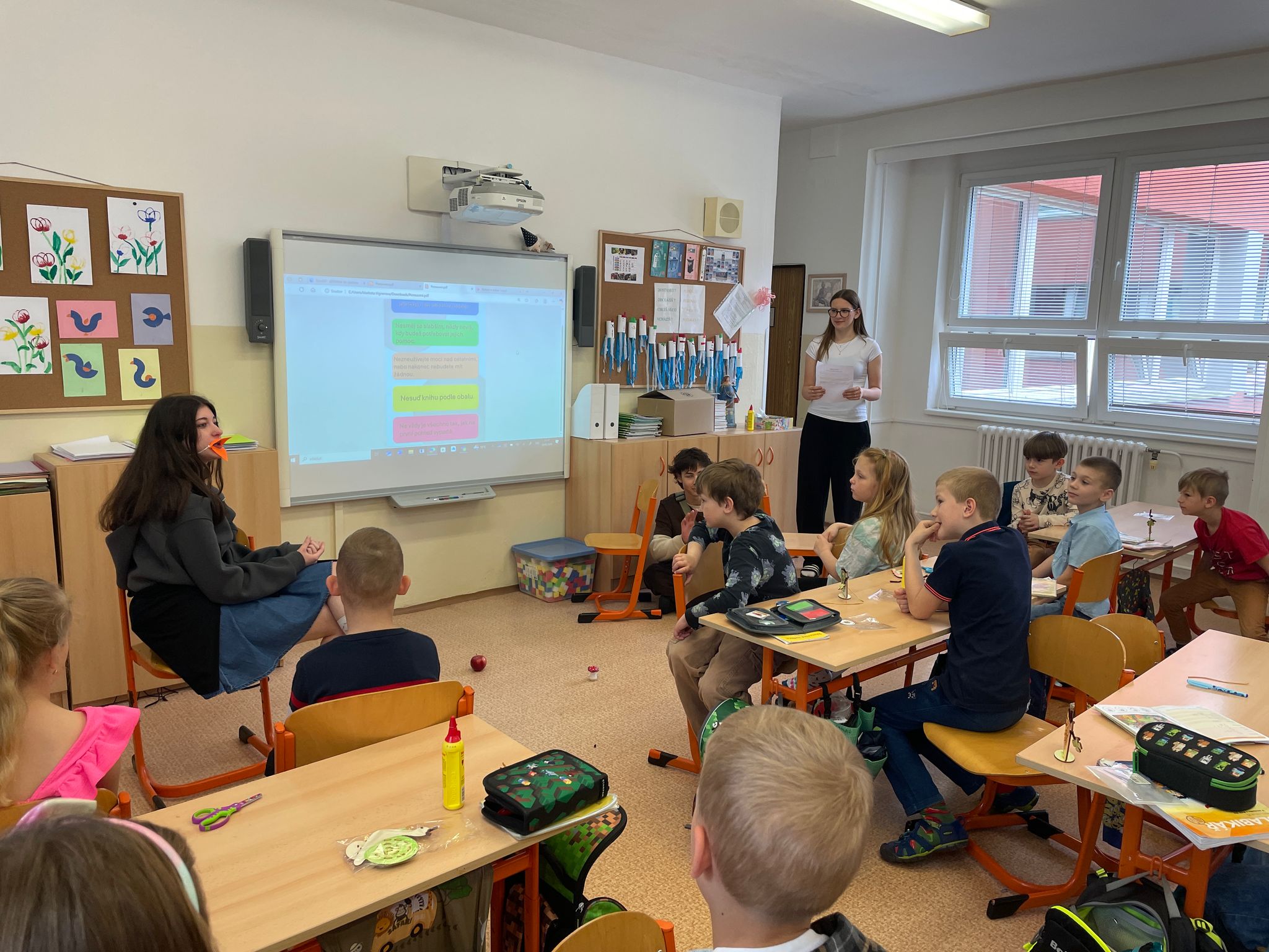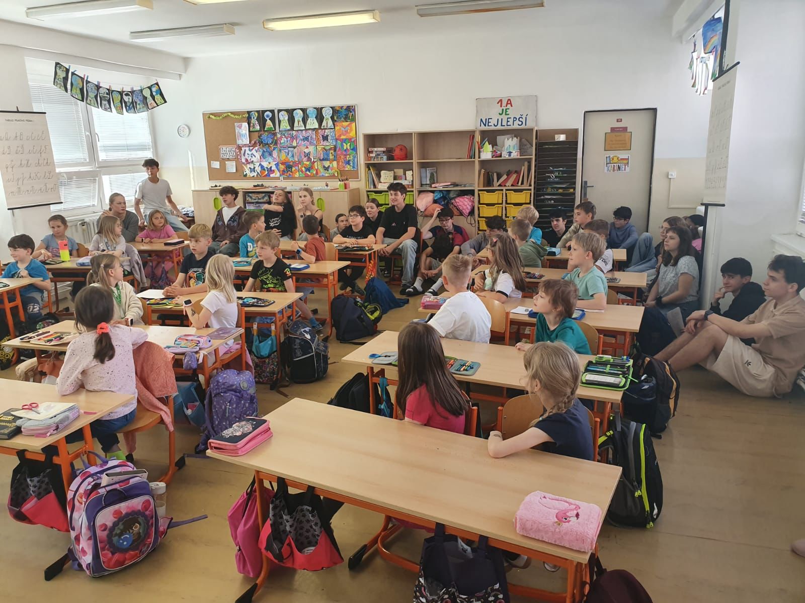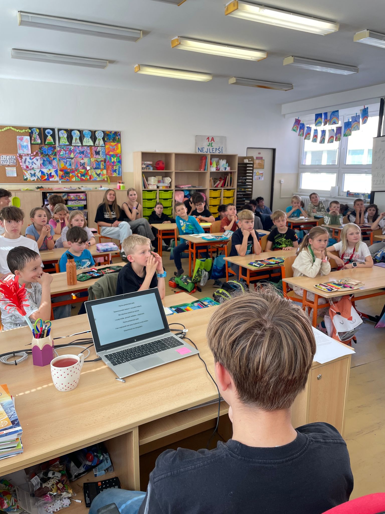 Deváťáci tvořili v hodině českého jazyka autorské bajky. Poté s nimi dále pracovali. Některé namluvili jako audionahrávku, některé zdramatizovali, k jedné vytvořili kulisy s loutkami. Všechny bajky pak představili nejmenším divákům a posluchačům naší školy, prvňáčkům. Těm se bajky natolik líbily, že se rozhodli je zilustrovat. Těšíme se na výslednou knihu bajek, která propojí nejmenší a nejstarší žáky naší školy.