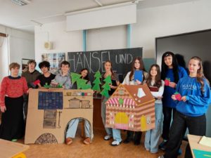 Dnešní den jsme svátečně zakončili divadlem, které si připravila 9.C v hodině německého jazyka. Děti se učily minulý čas na pohádkách bratří Grimmů. Vybraly si pohádku O perníkové chaloupce, kterou předvedly svým spolužákům napříč ročníky.
