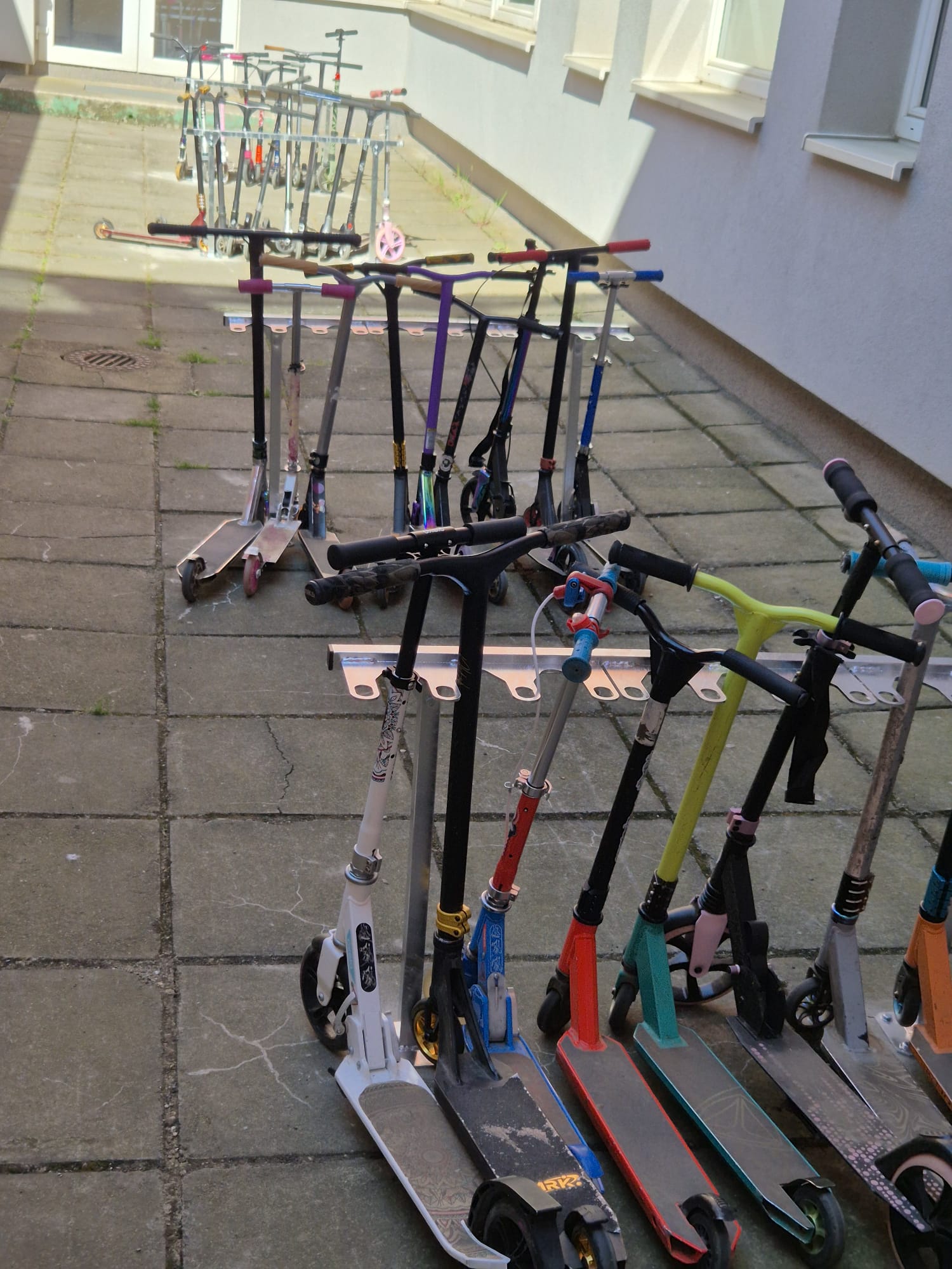 Stojany umožňují koloběžky bezpečně odkládat tak, aby se nepovalovaly na dlažbě a nepřekážely v pohybu. Zároveň je možné koloběžky uzamknout vlastním zámkem, což významně snižuje riziko jejich odcizení nebo nechtěné záměny.
