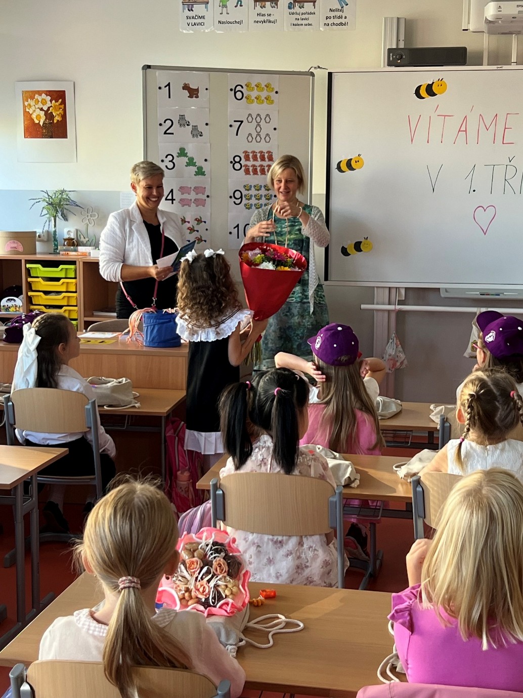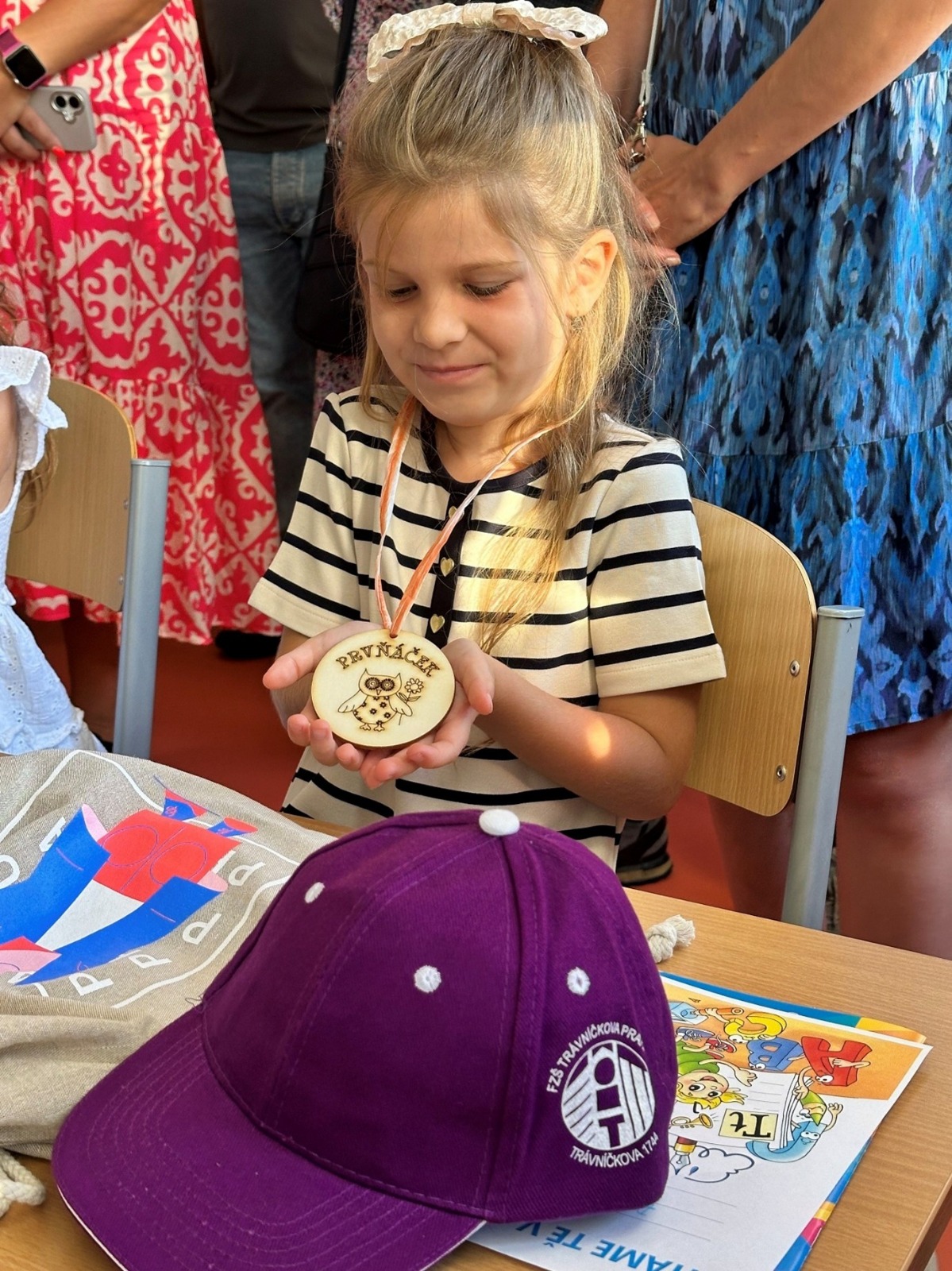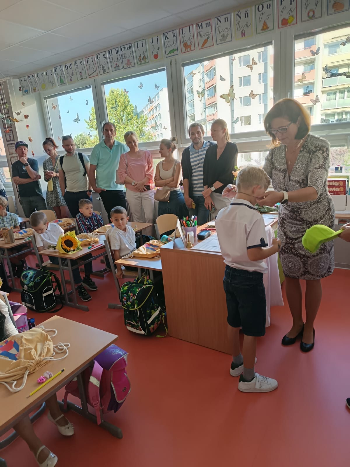 Součástí prvního školního dne bylo i symbolické pasování dětí na školáky. Každý prvňáček si odnesl barevnou kšiltovku, medaili s nápisem „Prvňáček“ a malý dárek na památku. Tento milý rituál dodal celému dni slavnostní nádech a zároveň pomohl dětem cítit se vítaně a bezpečně.