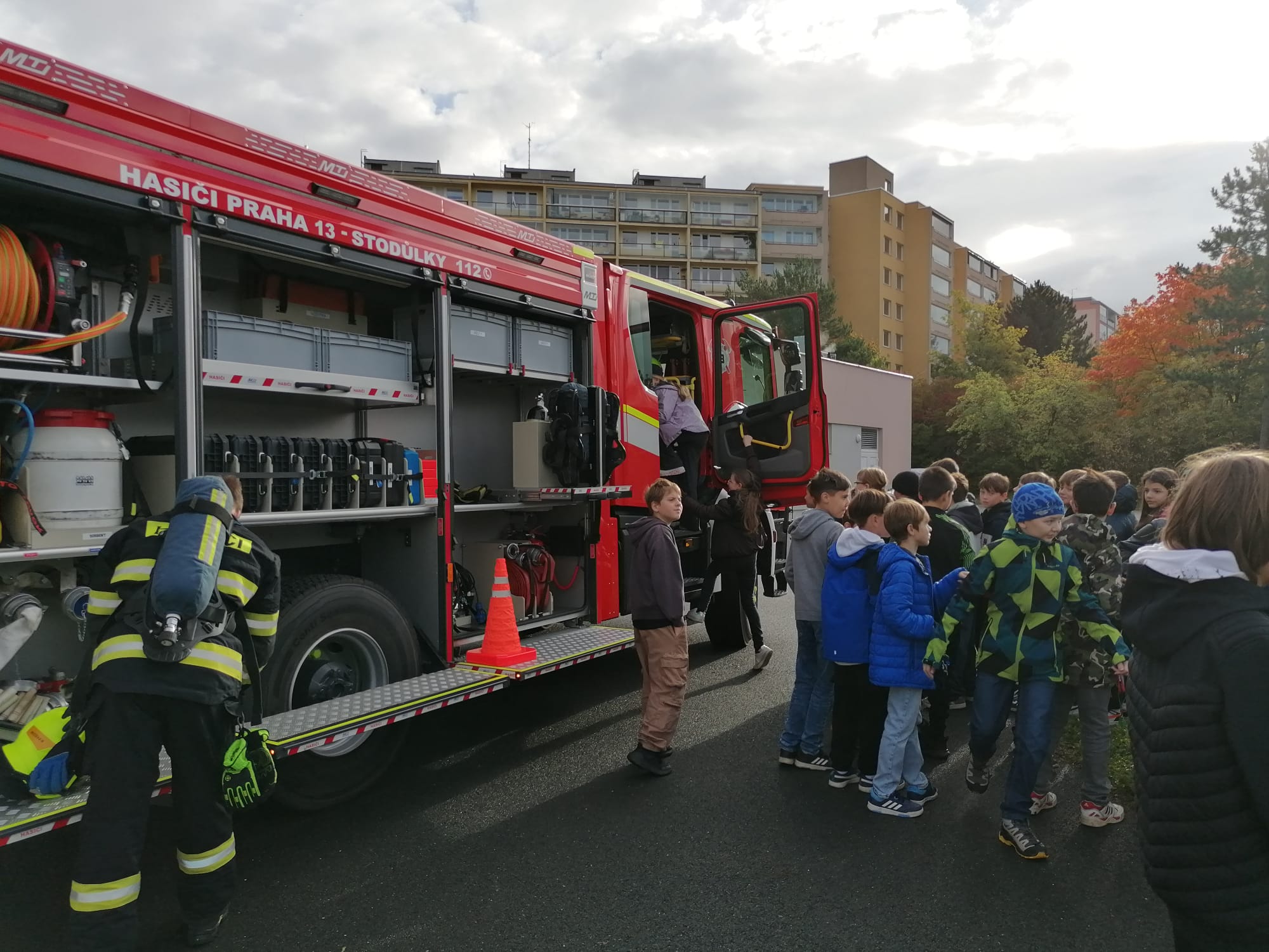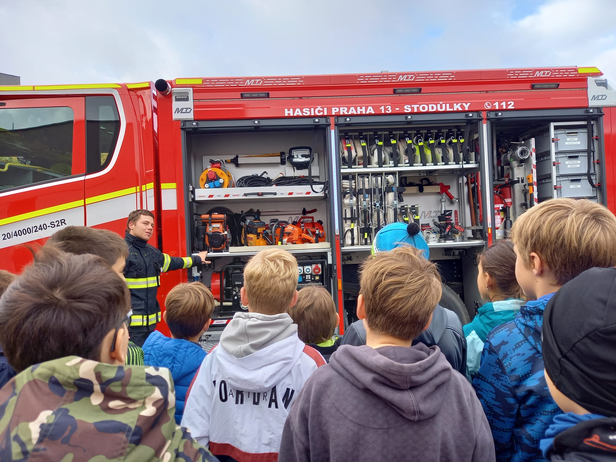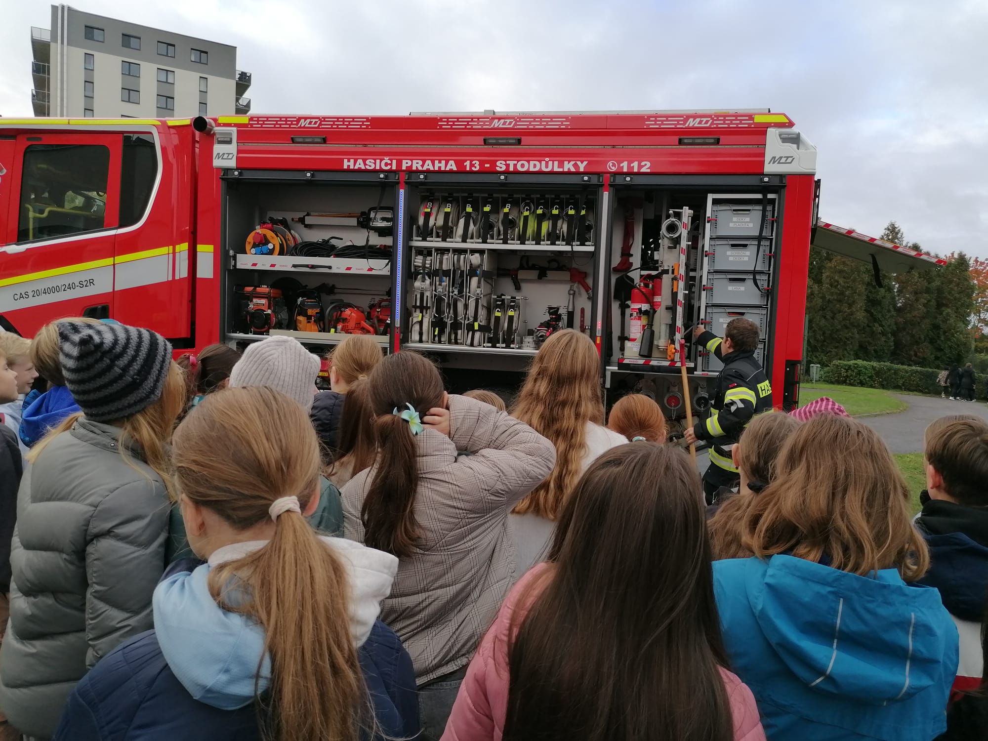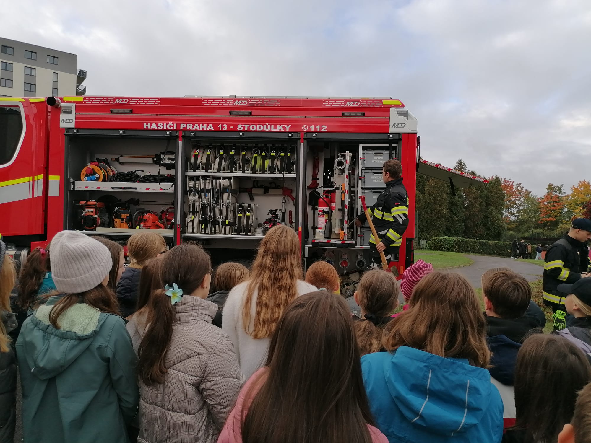Ve čtvrtek 9. 10. k nám do areálu přijeli s velkým hasičským autem představit svou práci a činnost dobrovolní hasiči ze Stodůlek. Tomáš z deváté třídy našim páťákům a potom i své třídě představil, co všechno jako dobrovolný hasič musí umět a co dělají děti na kroužku hasičů. Hasiči pak trpělivě zodpovídali všechny otázky zvídavých dětí. Páťáci si mohli sednout do hasičského auta a pořádně si ho tak prohlédnout a některé nástroje i obtěžkat. Ukázka byla velmi vydařená a děti nadšené. Děkujeme!