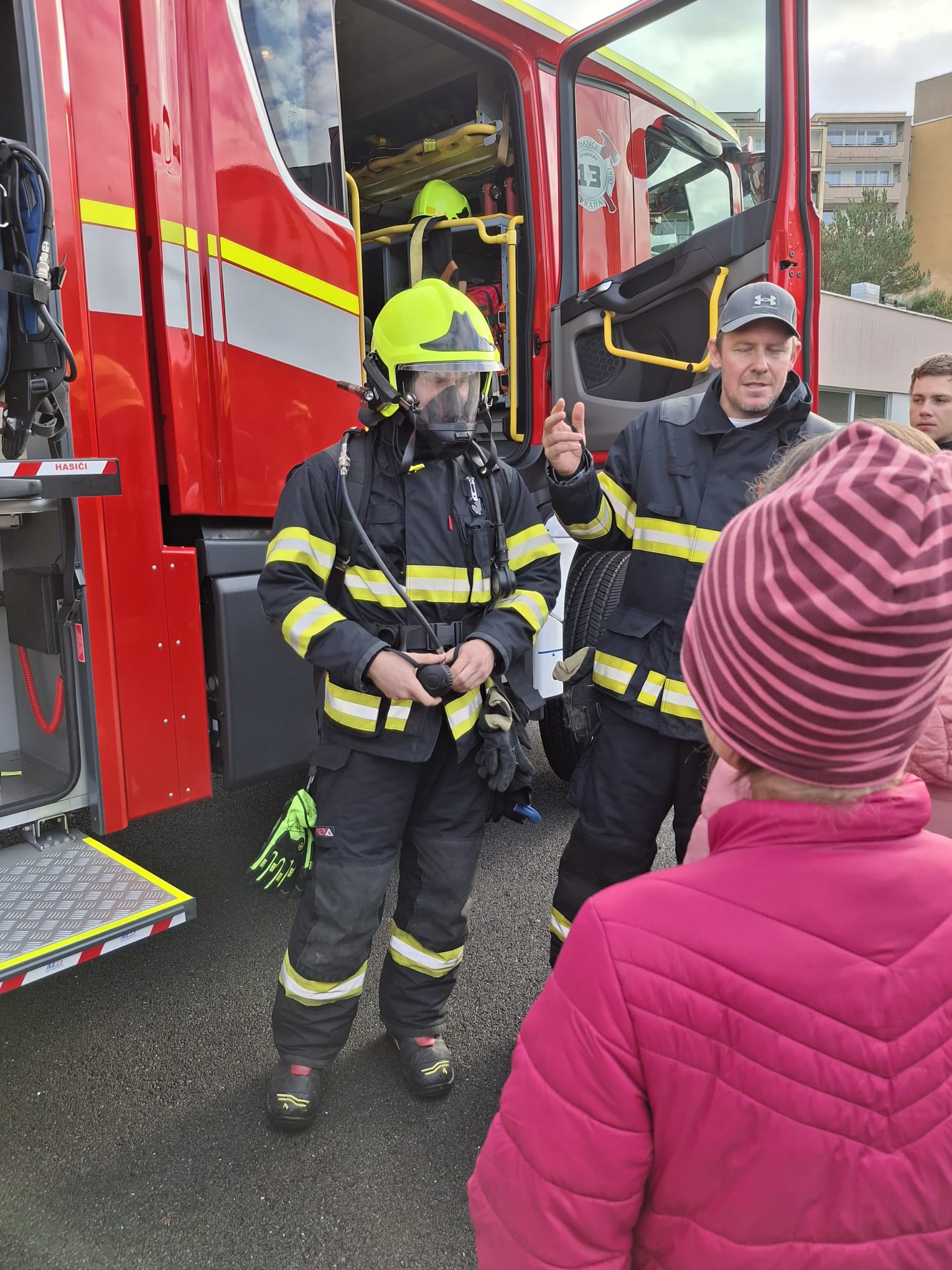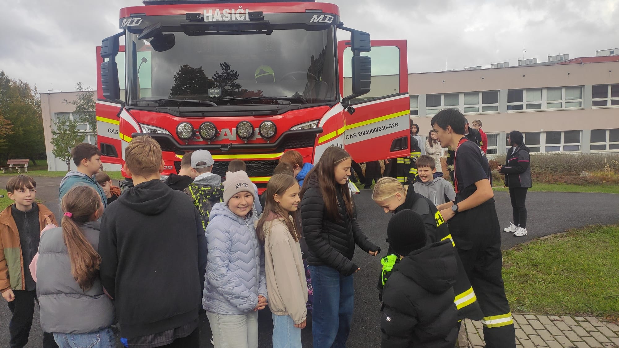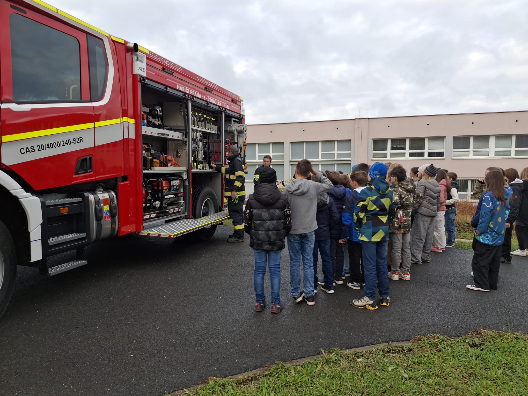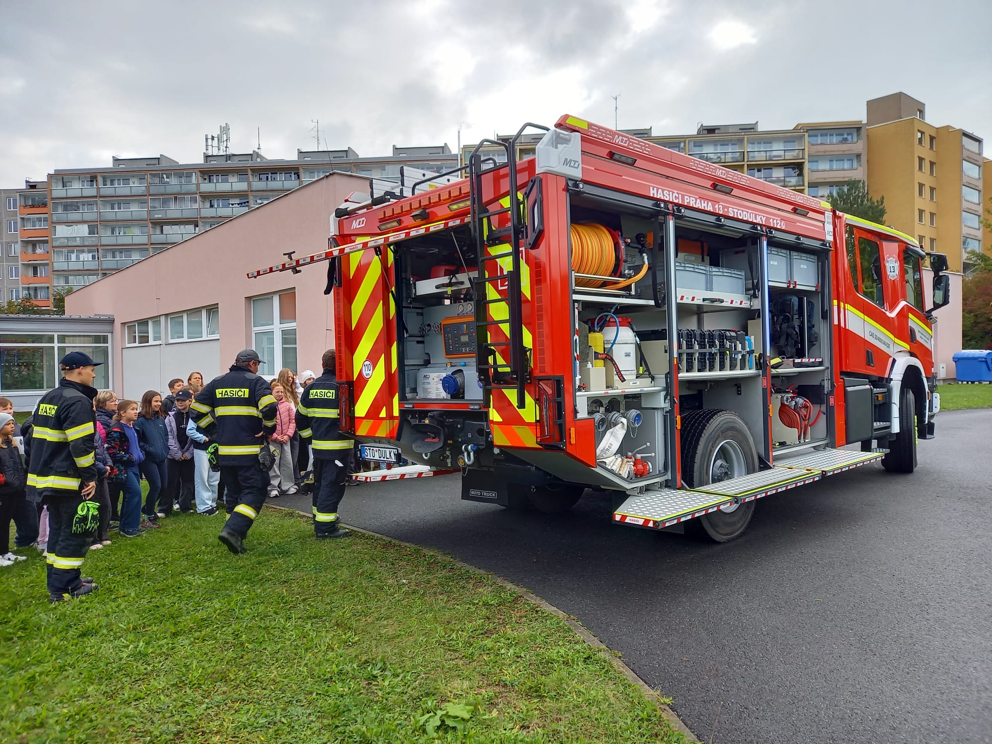 Ve čtvrtek 9. 10. k nám do areálu přijeli s velkým hasičským autem představit svou práci a činnost dobrovolní hasiči ze Stodůlek. Tomáš z deváté třídy našim páťákům a potom i své třídě představil, co všechno jako dobrovolný hasič musí umět a co dělají děti na kroužku hasičů. Hasiči pak trpělivě zodpovídali všechny otázky zvídavých dětí. Páťáci si mohli sednout do hasičského auta a pořádně si ho tak prohlédnout a některé nástroje i obtěžkat. Ukázka byla velmi vydařená a děti nadšené. Děkujeme!