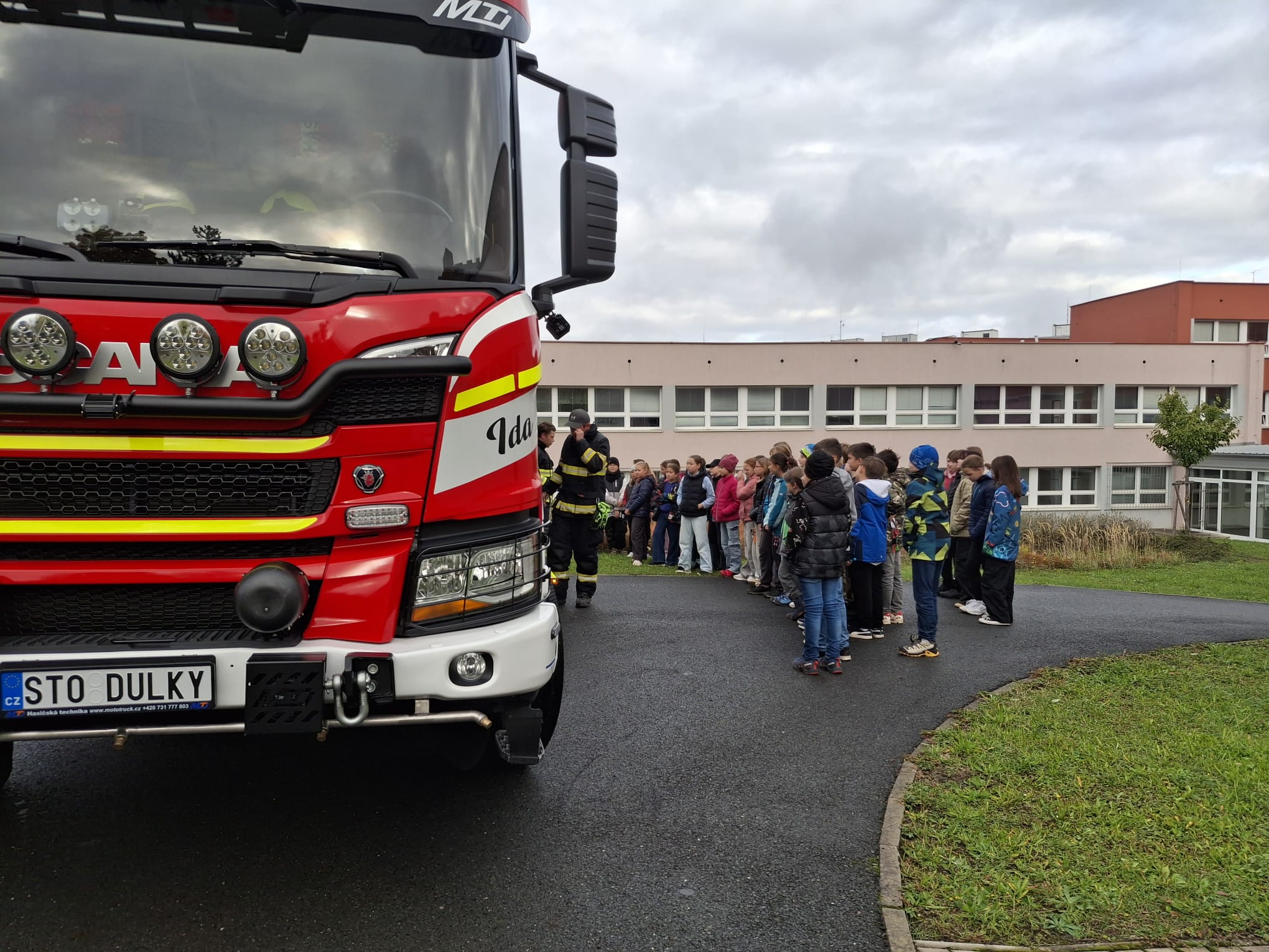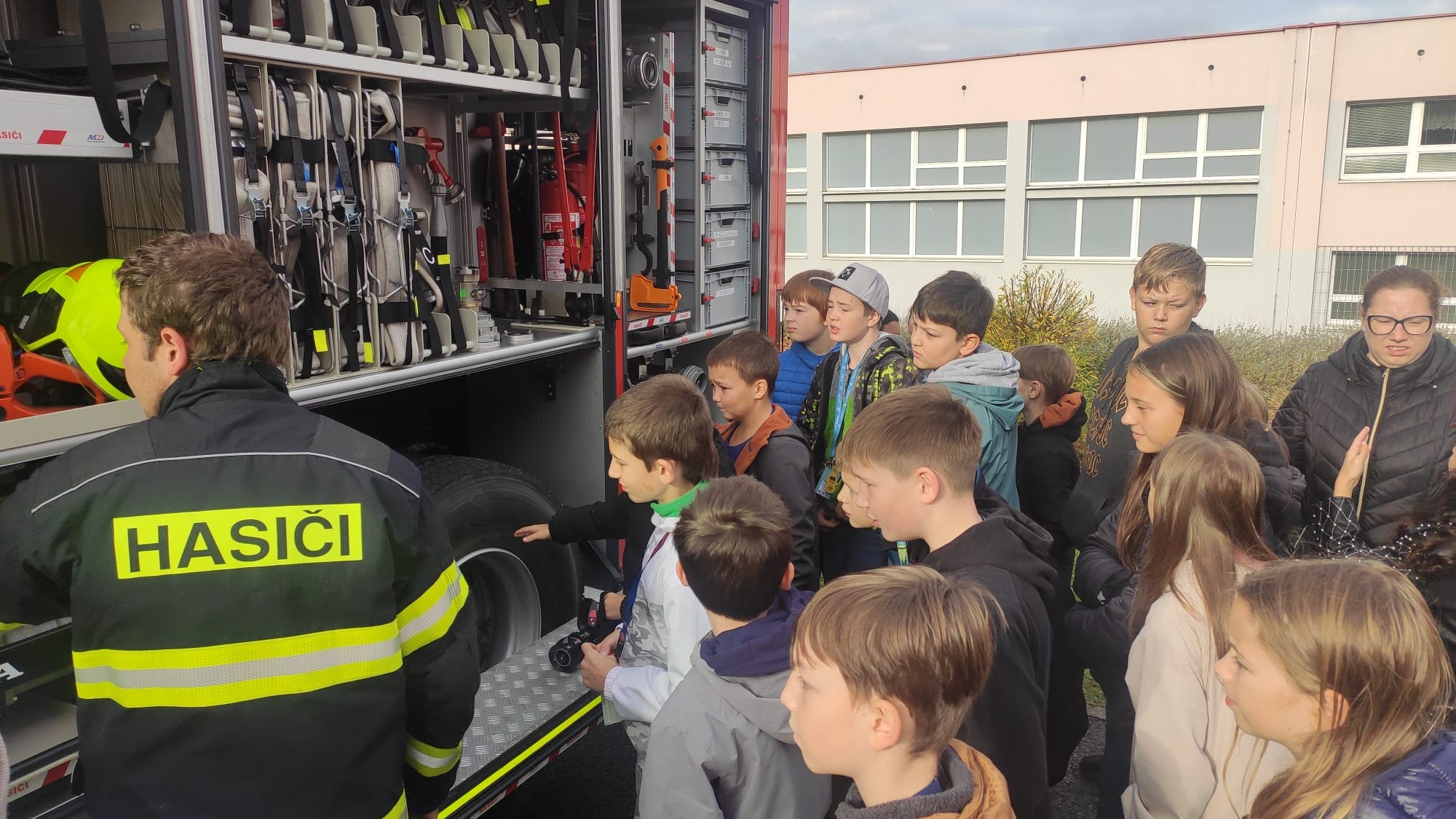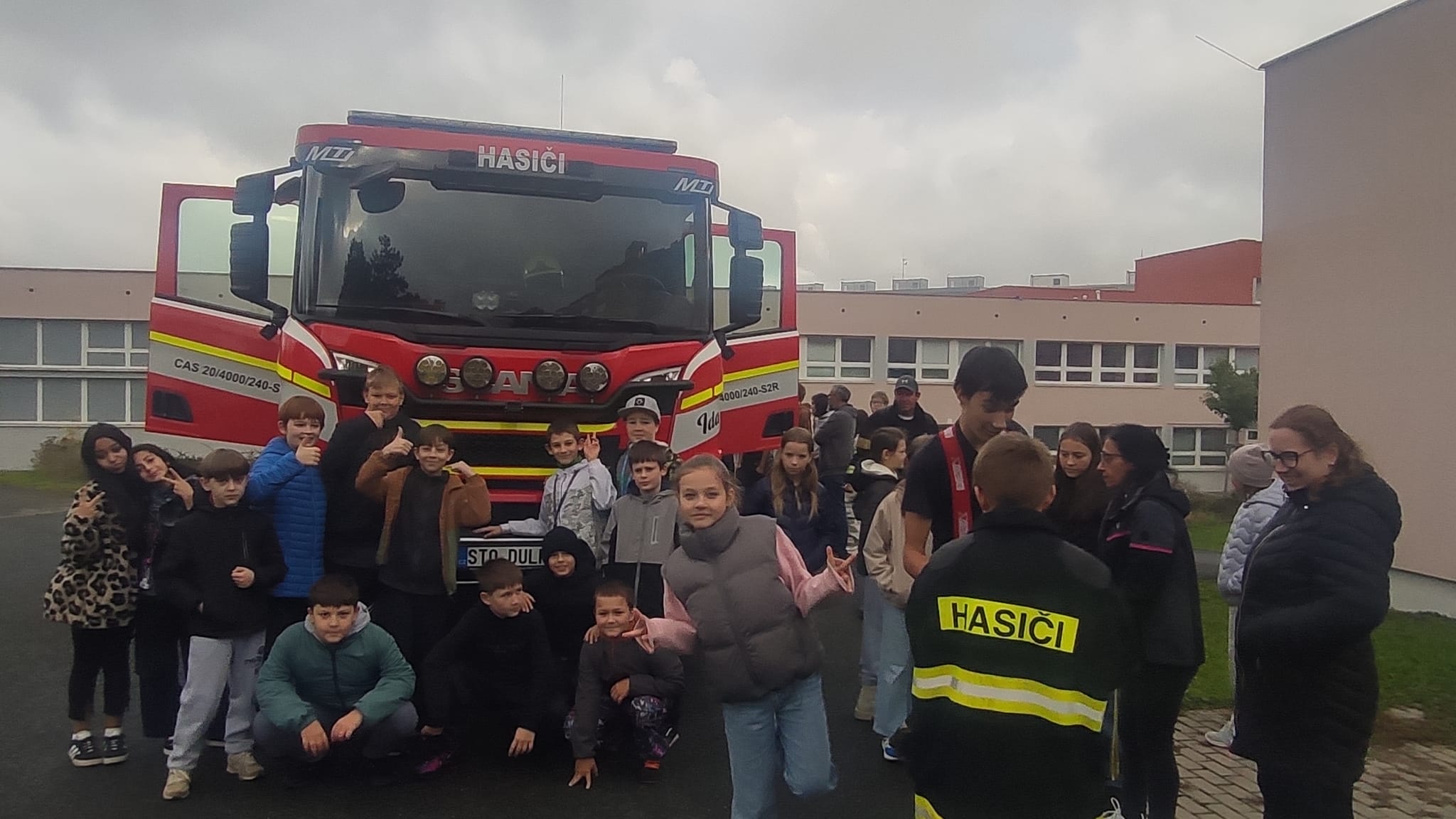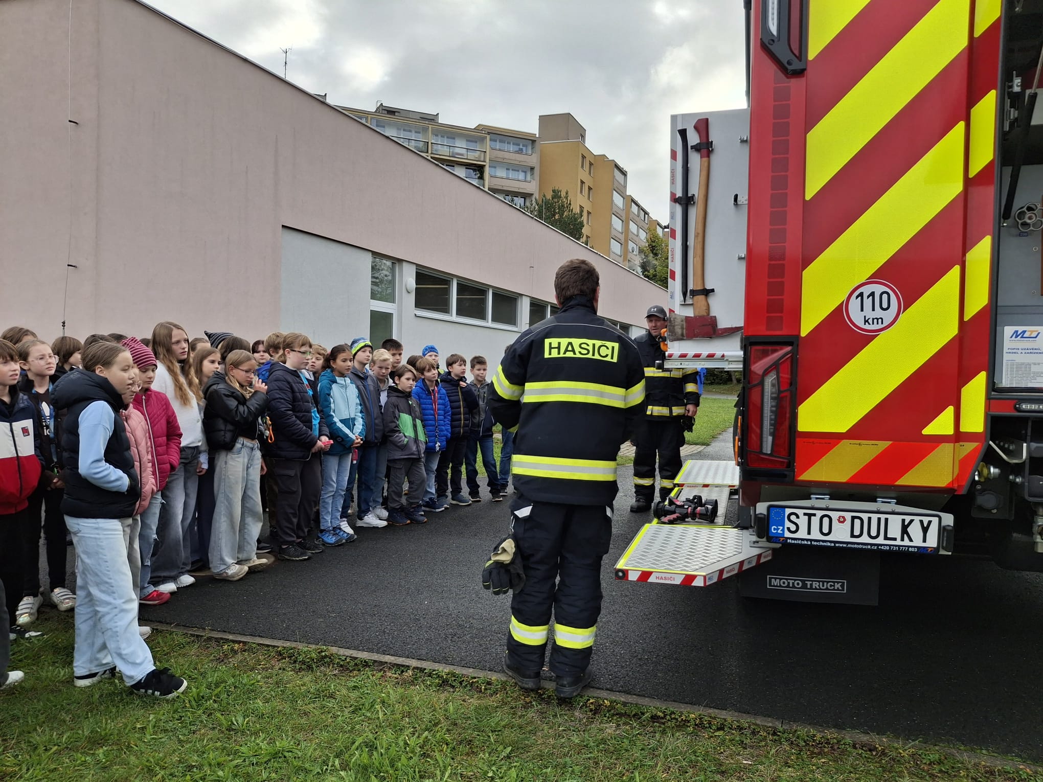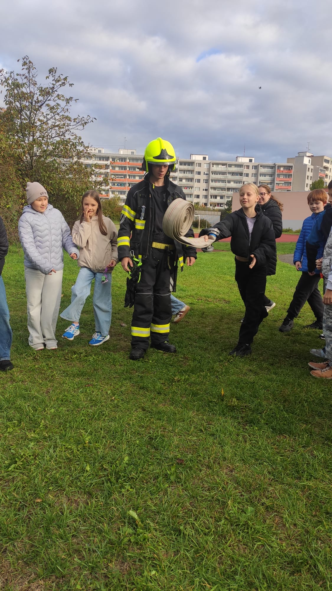 Ve čtvrtek 9. 10. k nám do areálu přijeli s velkým hasičským autem představit svou práci a činnost dobrovolní hasiči ze Stodůlek. Tomáš z deváté třídy našim páťákům a potom i své třídě představil, co všechno jako dobrovolný hasič musí umět a co dělají děti na kroužku hasičů. Hasiči pak trpělivě zodpovídali všechny otázky zvídavých dětí. Páťáci si mohli sednout do hasičského auta a pořádně si ho tak prohlédnout a některé nástroje i obtěžkat. Ukázka byla velmi vydařená a děti nadšené. Děkujeme!