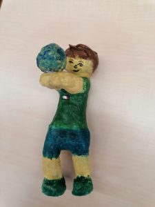 U toho jsme si zopakovali vědomosti o lidském těle a poměrech končetin k tělu a hlavě. Z alobalu jsme tvořili oporu těla (kostru), kterou jsme následně zpevnili papírovou páskou v dané pozici. Z novinového papíru jsme nakašírovali „svaly“ a z bílého papírového ubrousku jsme nakašírovali „kůži“. Pak už jsme jen namalovali kůži a oblečení a vše zalakovali, aby to více vydrželo:)